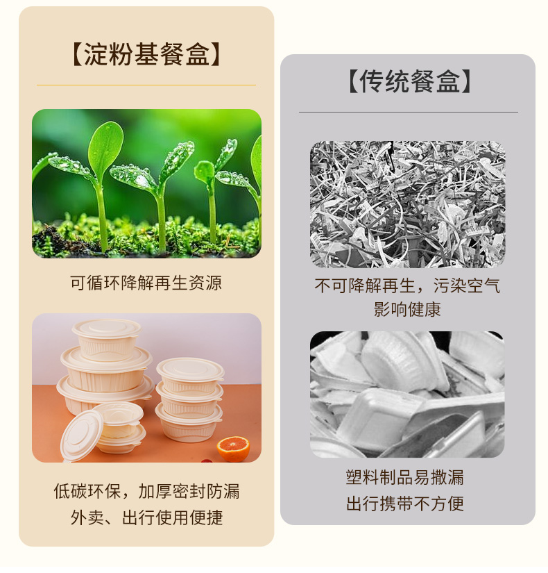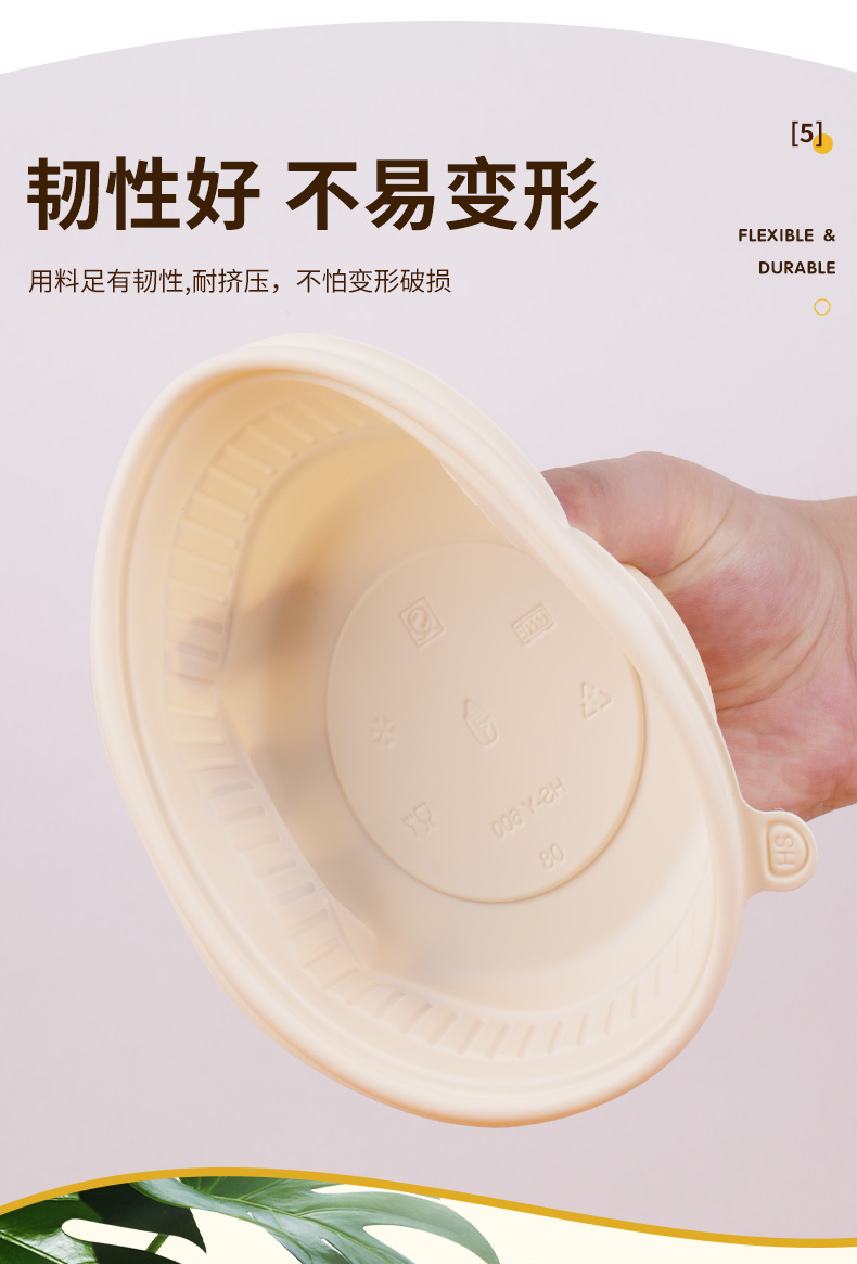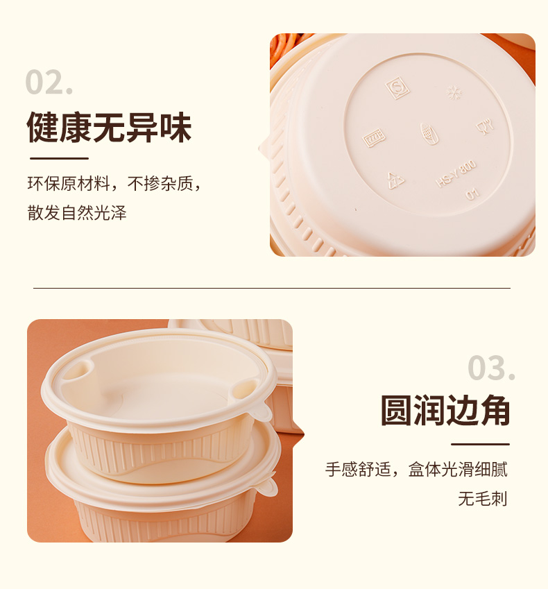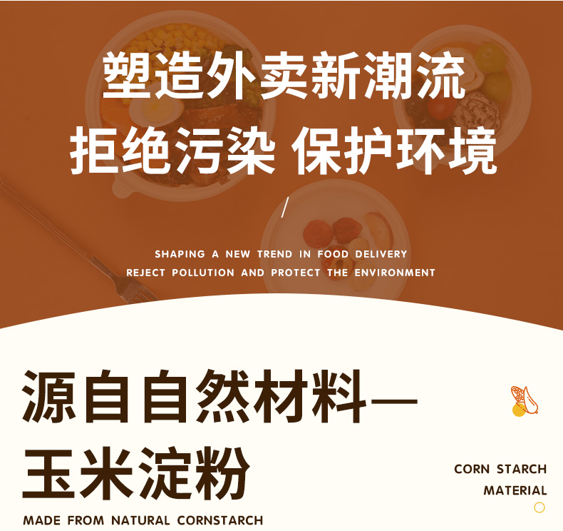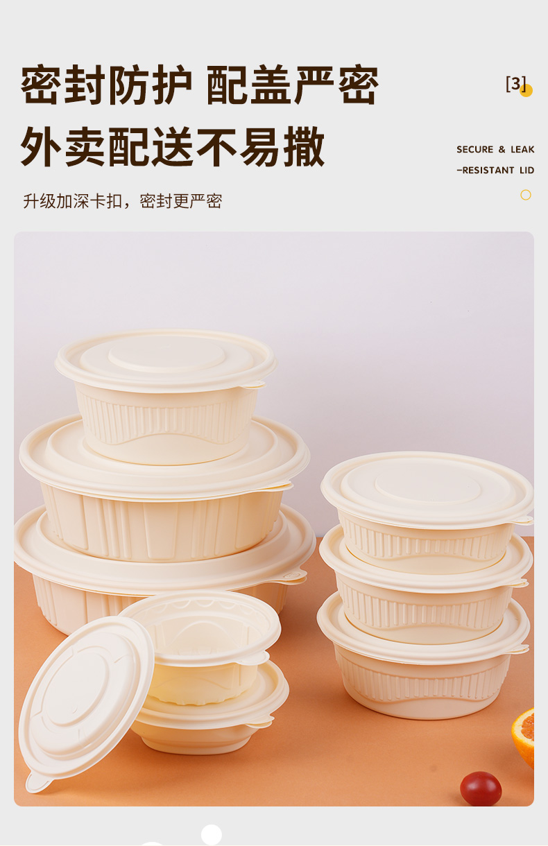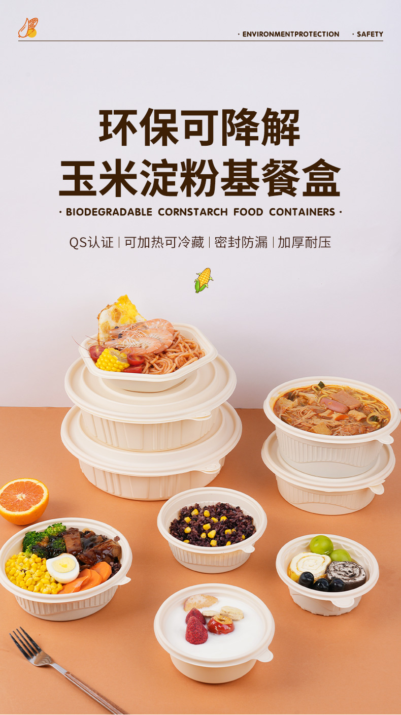 环保可降解玉米淀粉基餐盒,QS认证,可加热可冷藏,密封防漏,加厚耐压。密封防护,配盖严密,外卖配送不易撒,升级加深卡扣,密封更严密。