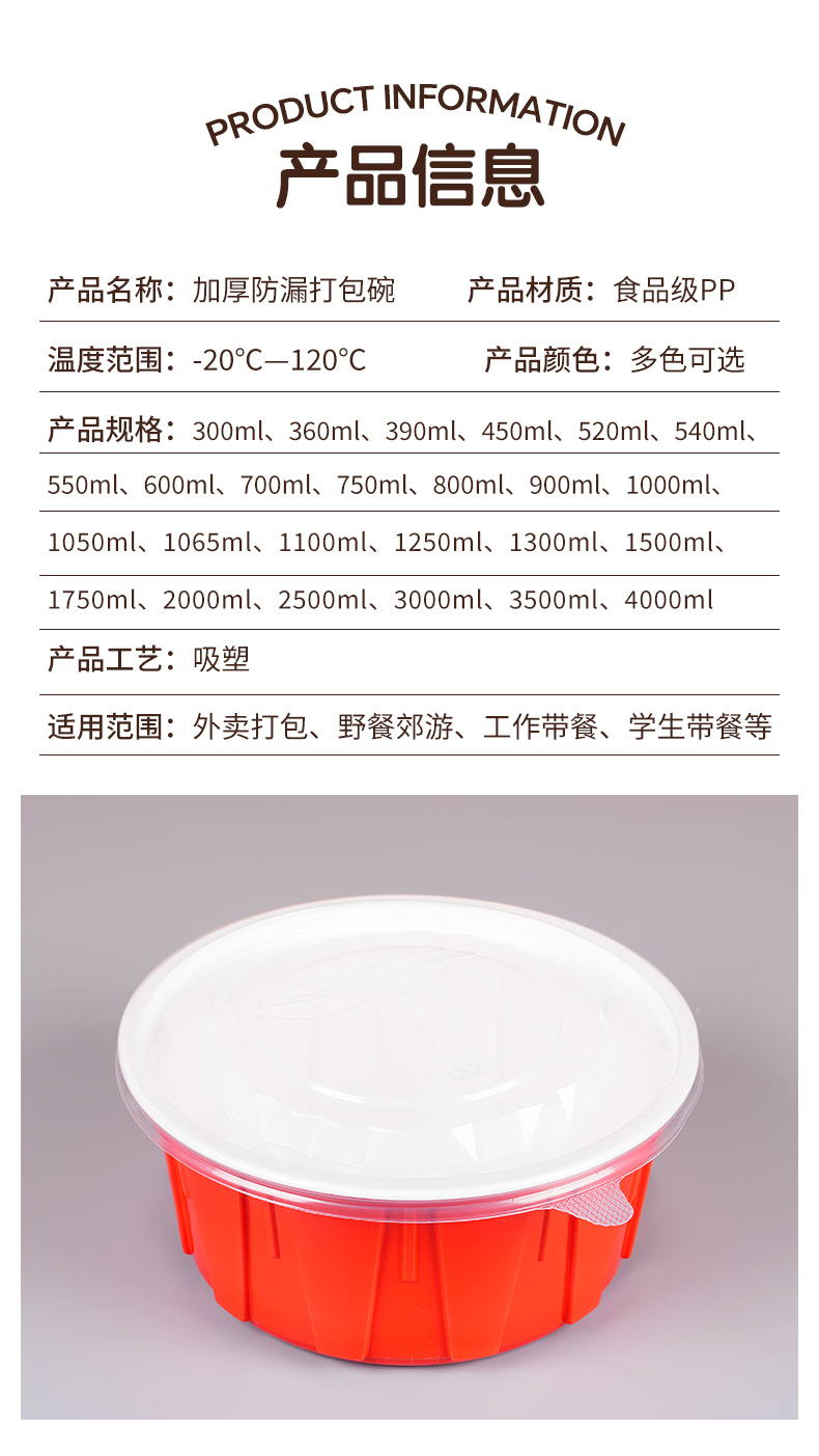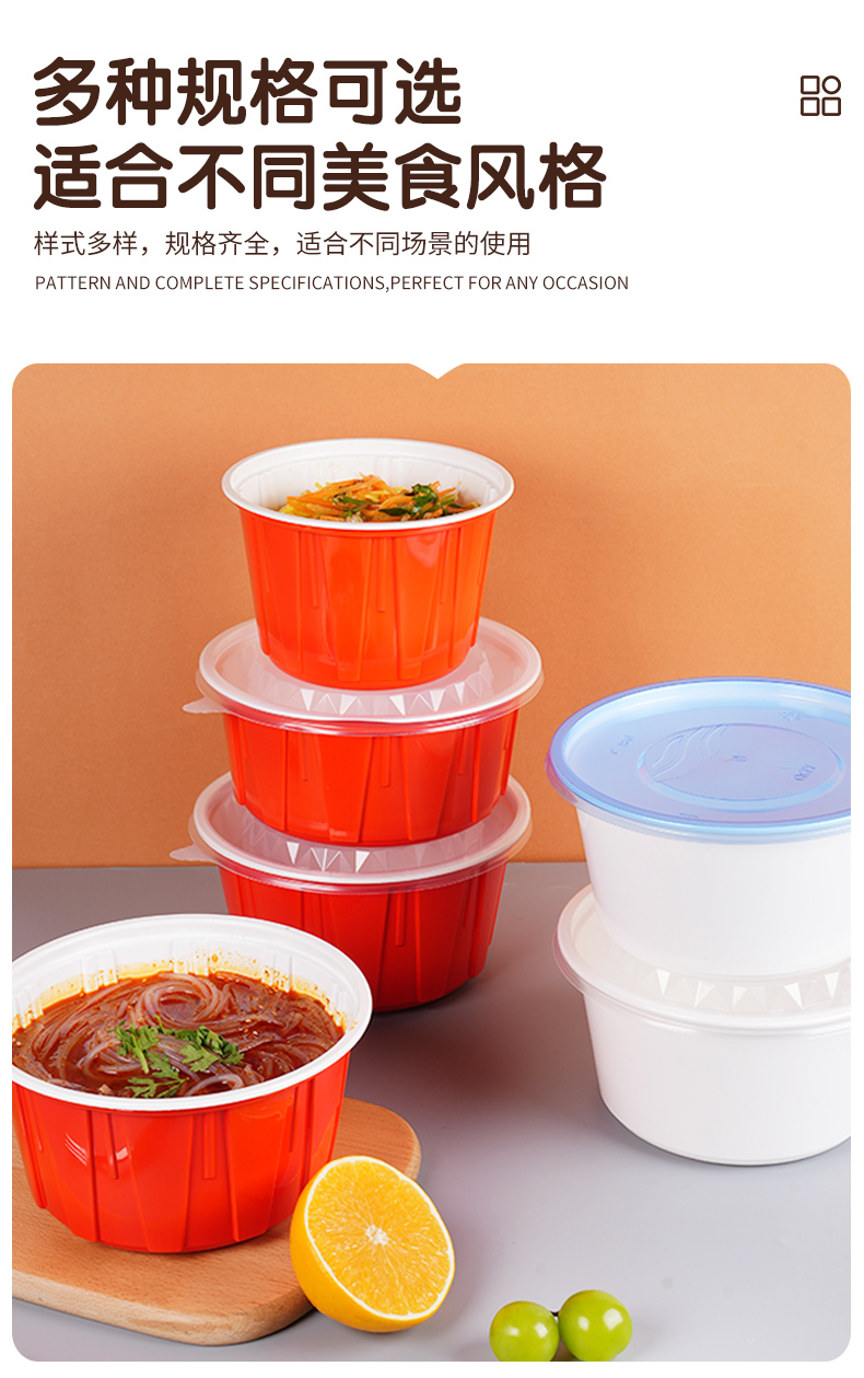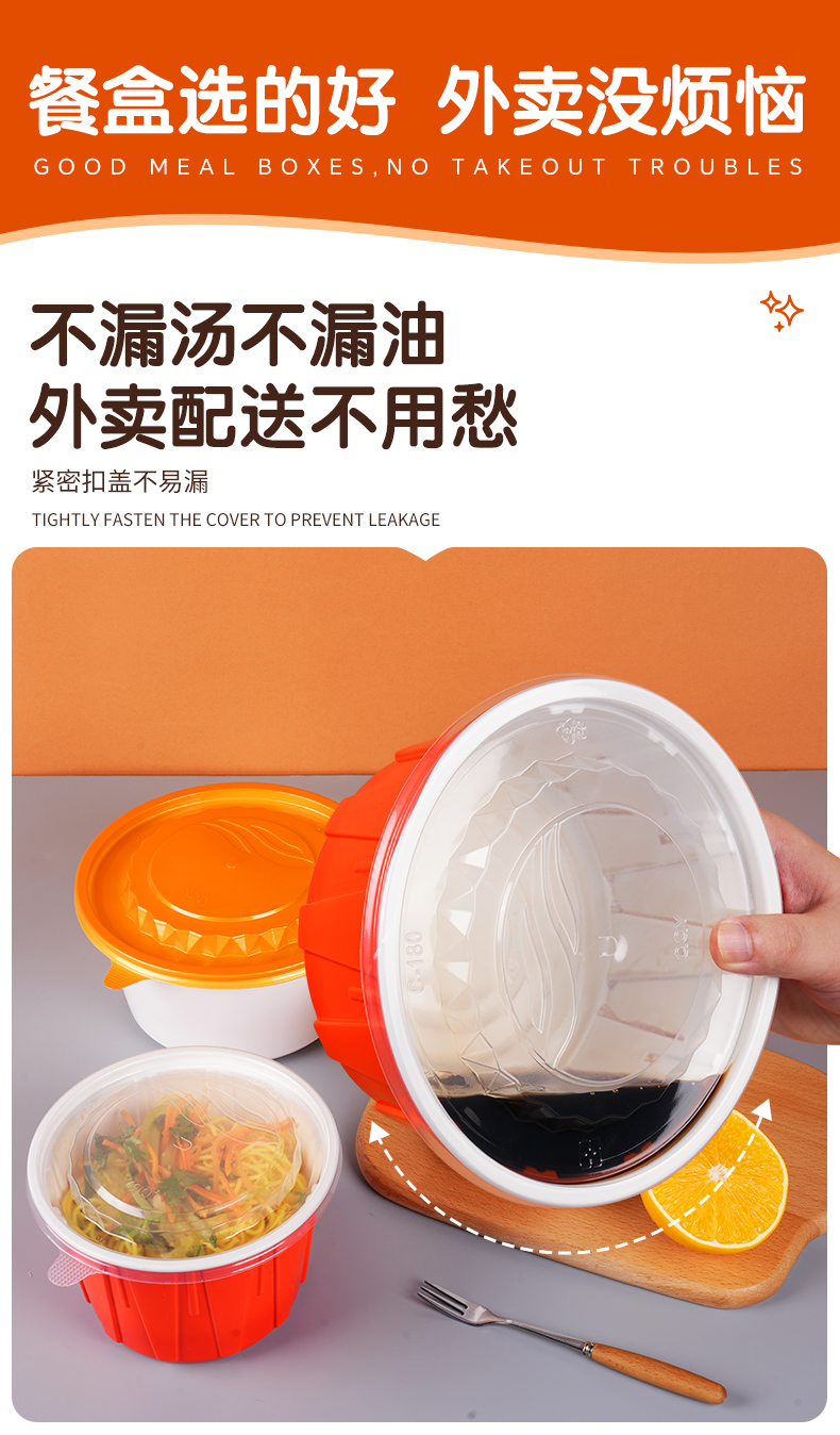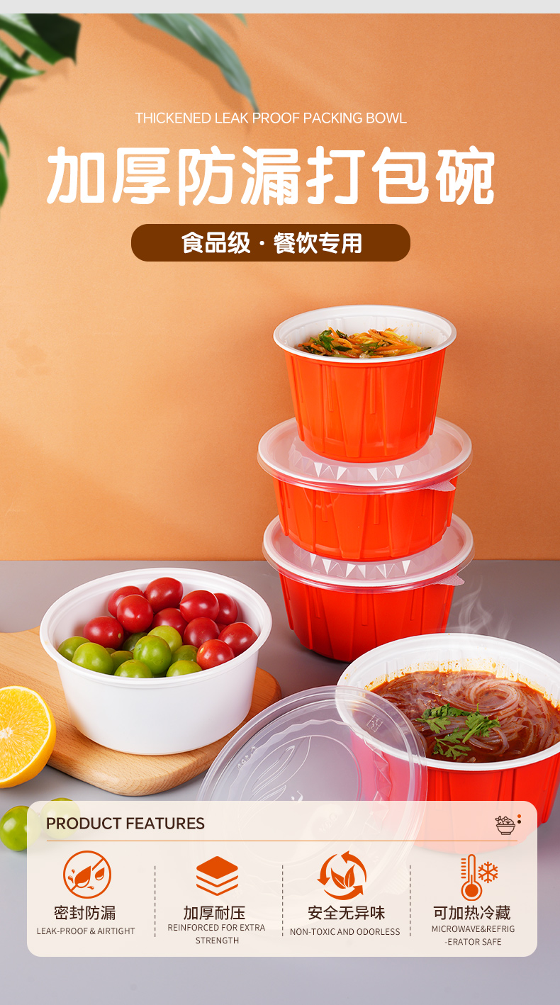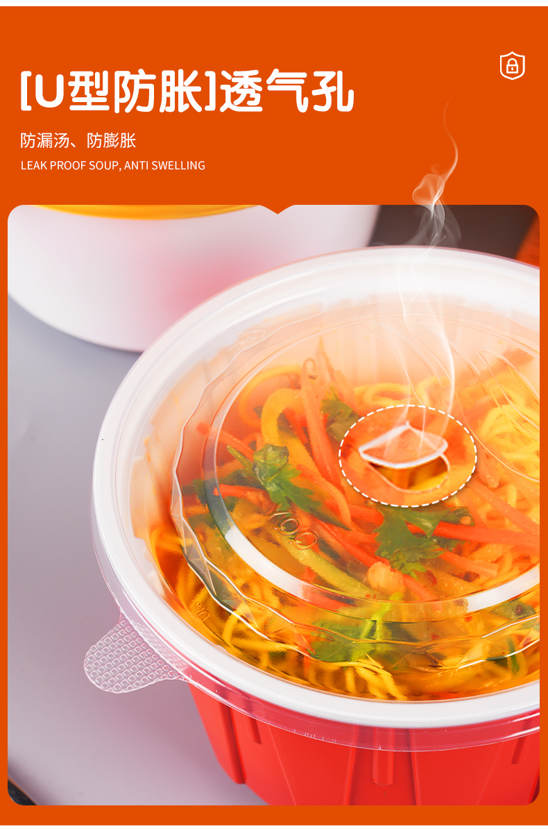 加厚防漏打包碗,食品级餐饮专用。支持定制,免费设计,为您打造专属包装,提高品牌传播度,提升店铺影响力。不漏汤不漏油,外卖配送不用愁,紧密扣盖不易漏。U型防胀透气孔,防漏汤、防膨胀。