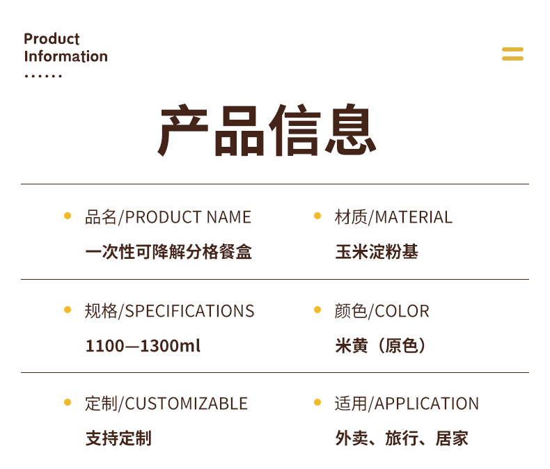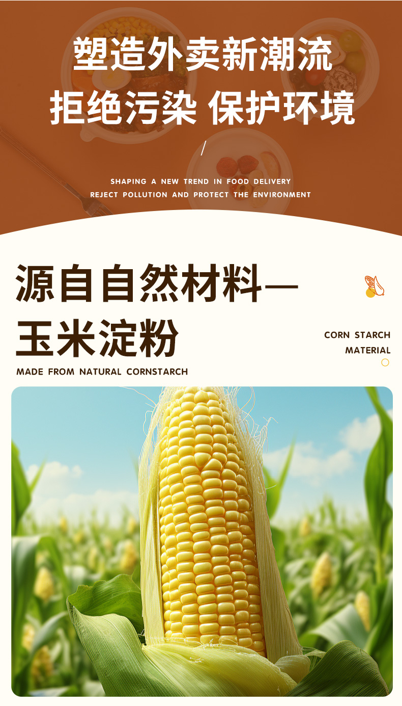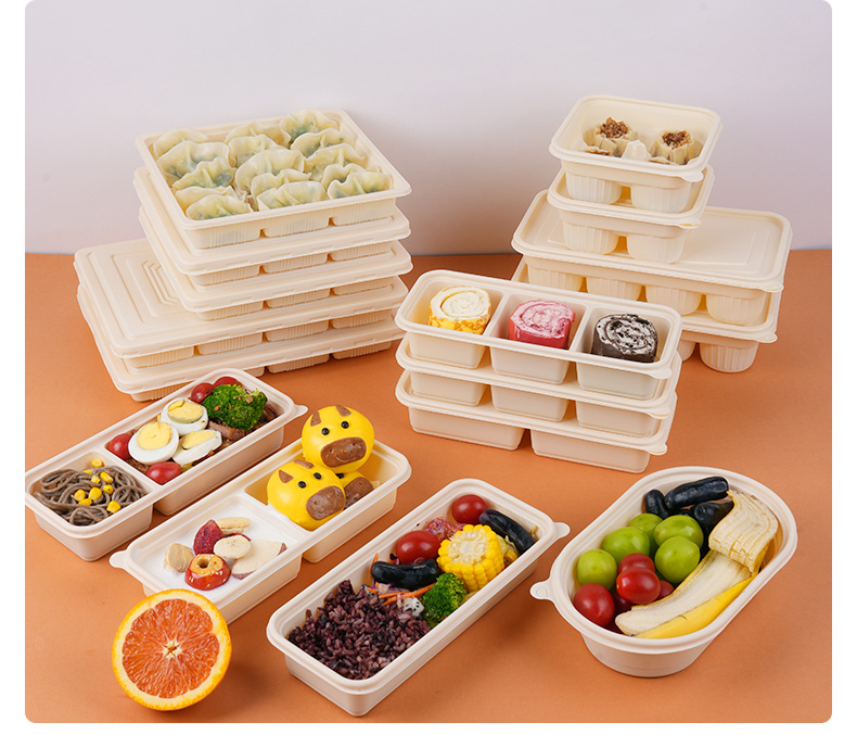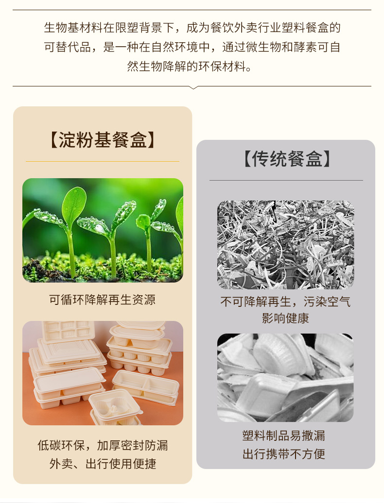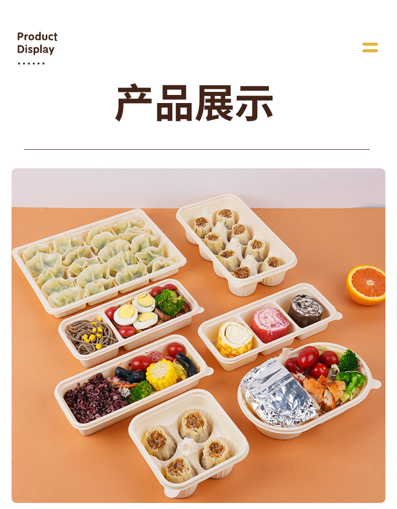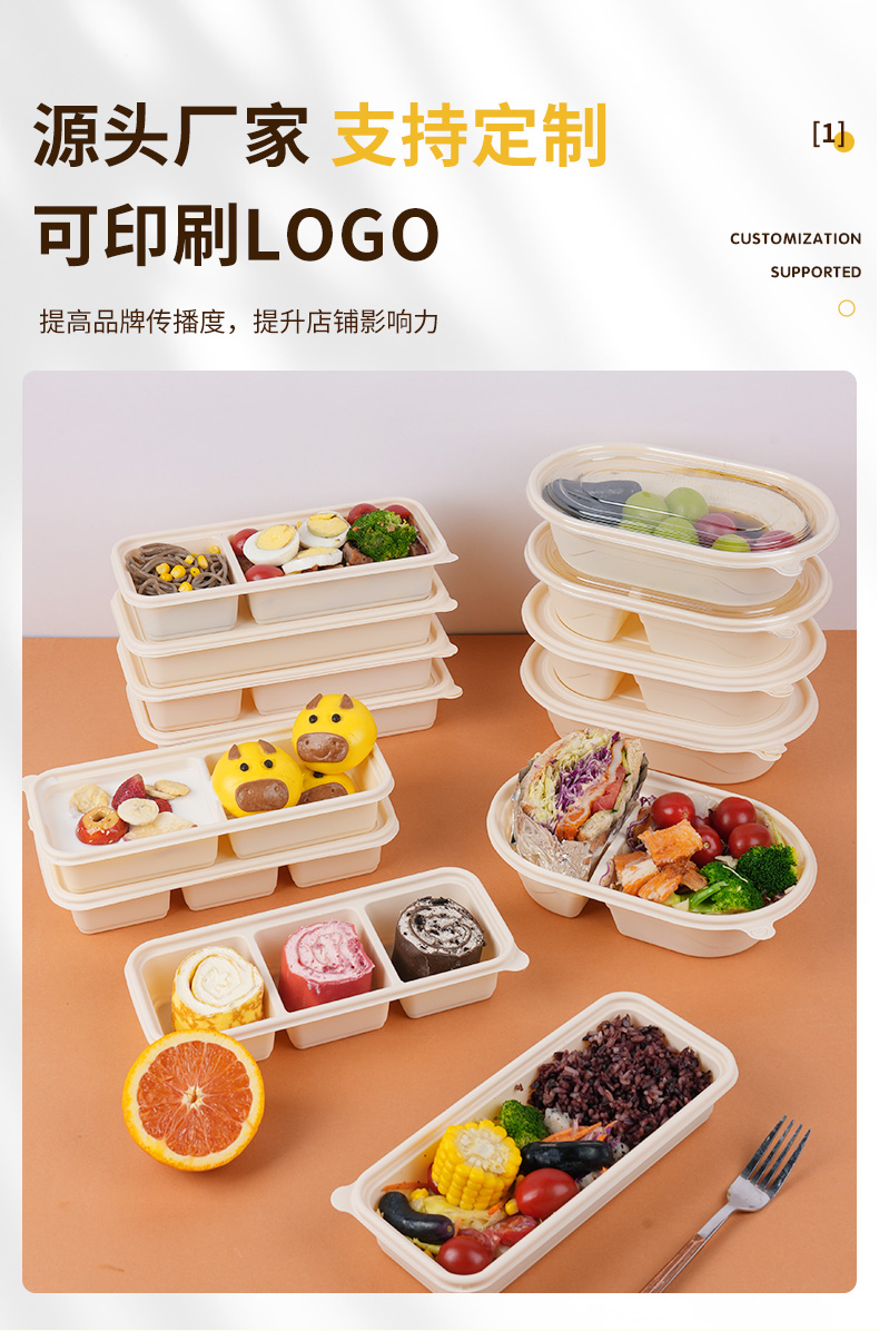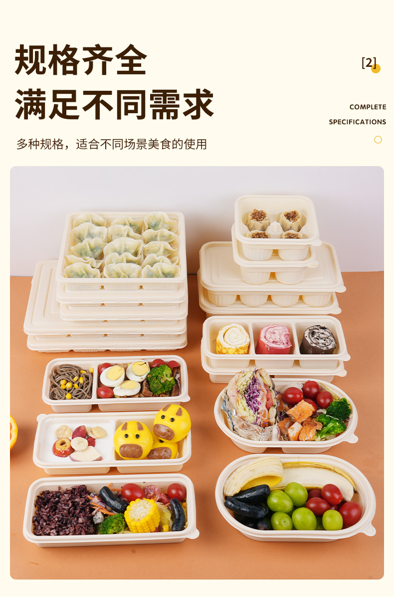环保可降解玉米淀粉基餐盒,QS认证,可加热可冷藏,密封防漏,加厚耐压。源头厂家,支持定制,可印刷LOGO,提高品牌传播度,提升店铺影响力。规格齐全,满足不同需求,多种规格,适合不同场景美食的使用。