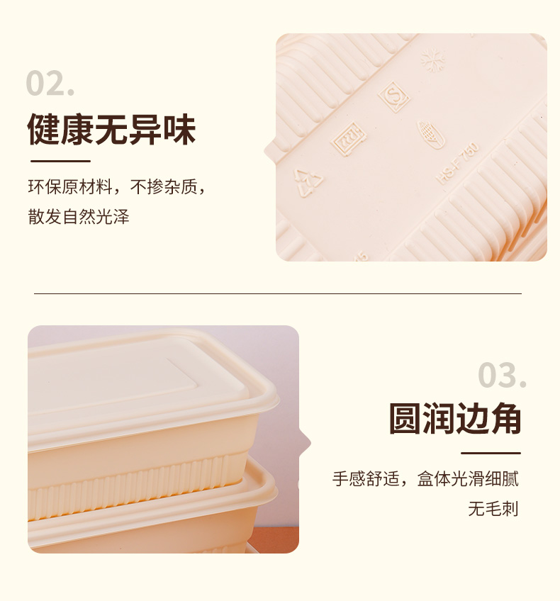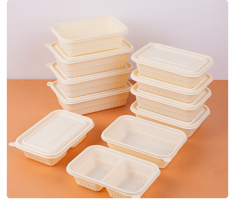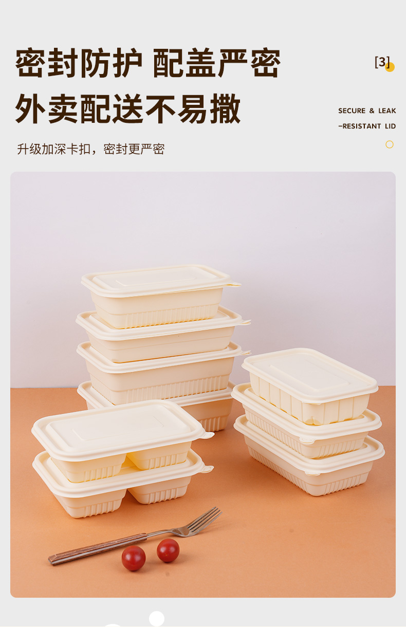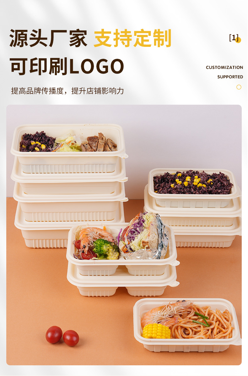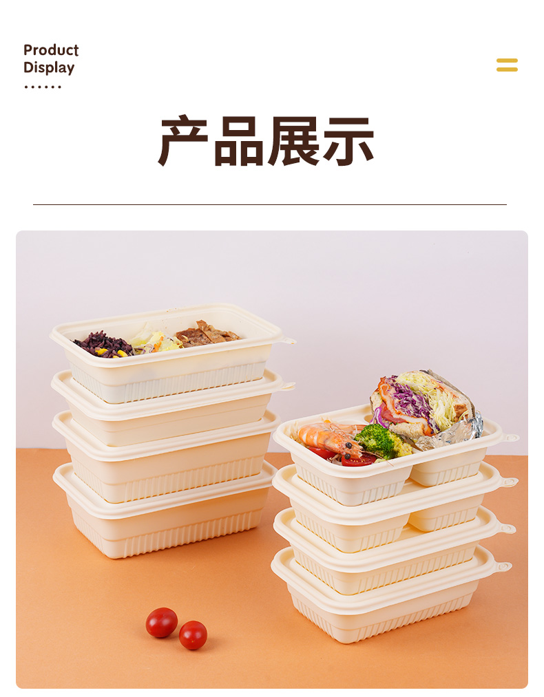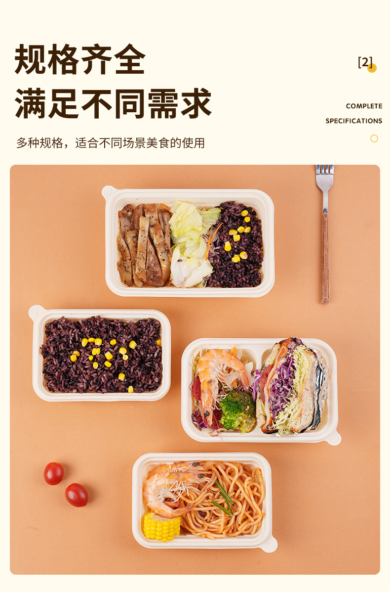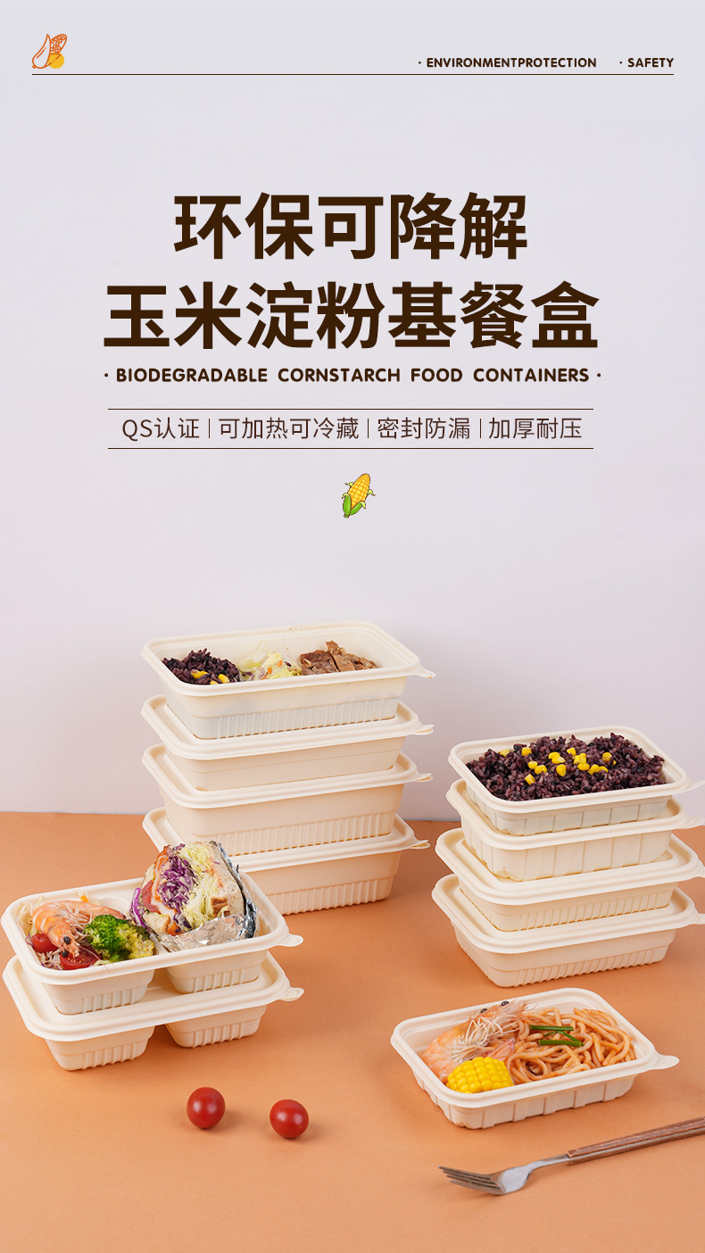 环保可降解玉米淀粉基餐盒,QS认证,可加热可冷藏,密封防漏,加厚耐压。源头厂家,支持定制,可印刷LOGO,提高品牌传播度,提升店铺影响力。规格齐全,满足不同需求,多种规格,适合不同场景美食的使用。
