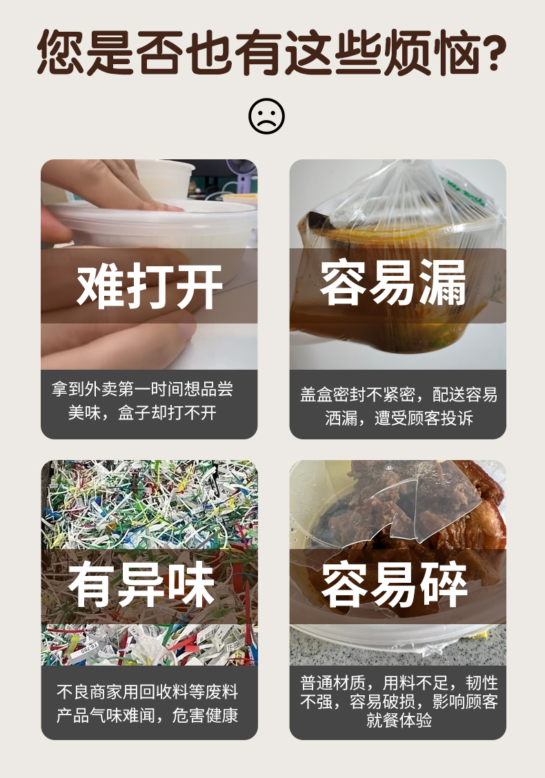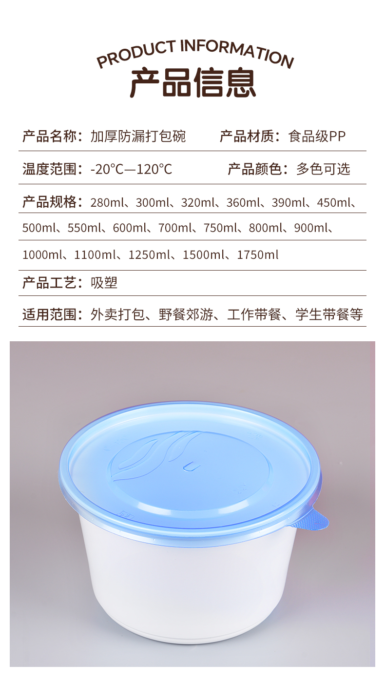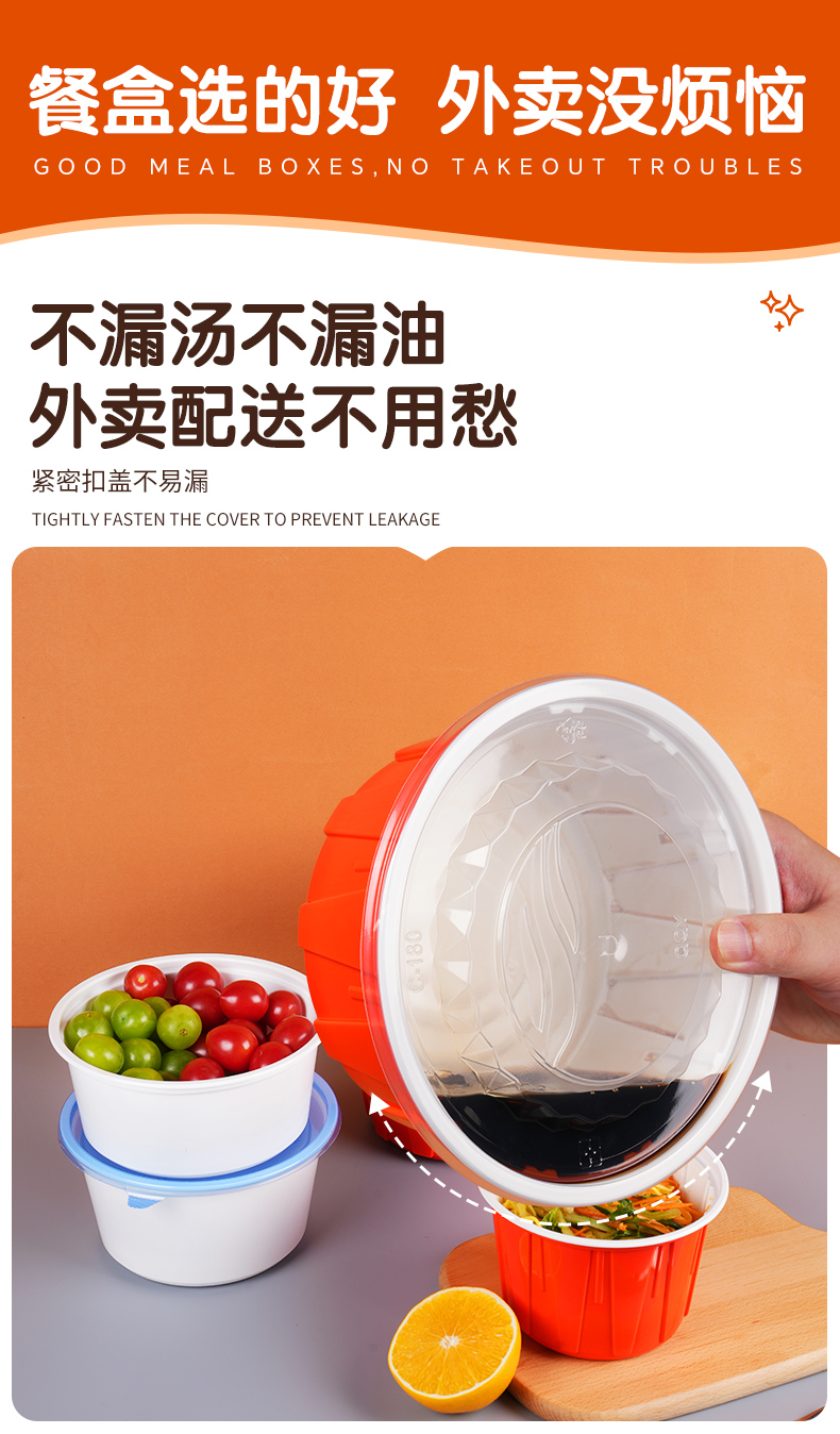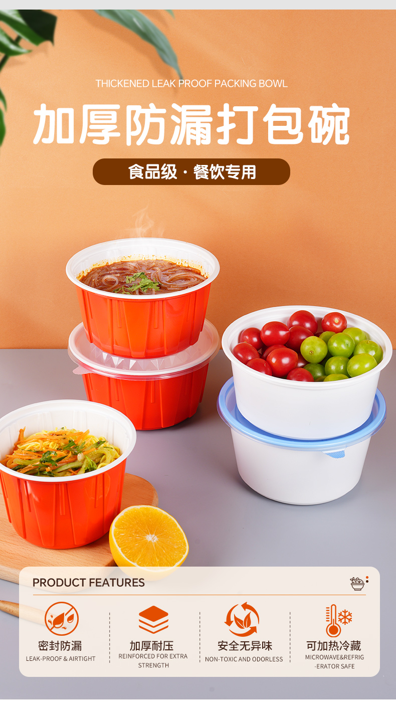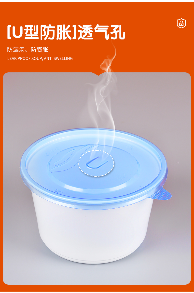 加厚防漏打包碗,食品级餐饮专用。支持定制,免费设计,为您打造专属包装,提高品牌传播度,提升店铺影响力。不漏汤不漏油,外卖配送不用愁,紧密扣盖不易漏。U型防胀透气孔,防漏汤、防膨胀。